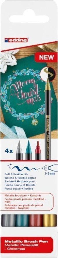 Štětcový popisovač, sada 4 ks v metalických barvách. Jeho hrot je měkký, pružný, ve tvaru štětce. Kreslení štětcovým fixem dodá Vašemu tvoření krásné výsledky v mnoha zářivých barvách. Jednoduše a s lehkostí s ním nakreslíte květinové motivy i postavy. Perfektní je i pro ozdobné psaní. Hrot štětce má proměnnou šířku tahu, umožňuje tak vytvářet jemné detaily i široké tahy, a to i na velkých plochách. Populární je pro použití na měkkých materiálech. Ideální na světlý papír nebo karton.