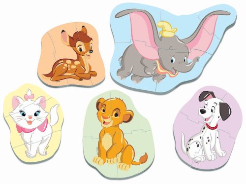 pět progresívních puzzle od 3 do 5 dílků velké a silné dílky pro snadnější držení rozvíjí dětskou pozornost, podporují psychomotorický vývoj, představivost a podporují zvědavost roztomilé dětské obrázky