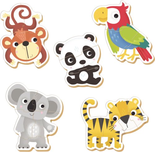 pět progresívních puzzle od 3 do 5 dílků velké a silné dílky pro snadnější držení rozvíjí dětskou pozornost podporují psychomotorický vývoj představivost a podporují zvědavost