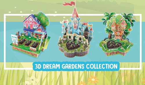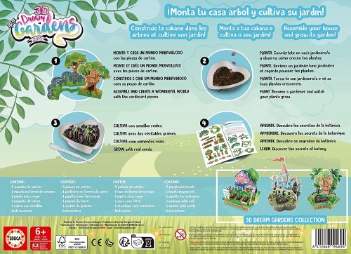 Kreativní sada EDUCA 3D Dream Gardens pro výrobu miniaturní zahrádky se skutečnými semínky doplněná kulisami stromového domu. Složte 3D puzzle, zasaďte semínka a vytvořte si kouzelný svět plný příběhů.