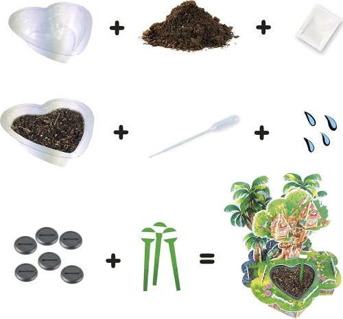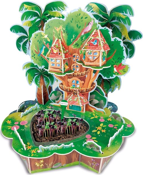 2v1 - postav dům na stromě a starej se o zahrádku součástí výrobku jsou semínka (vzklíčí během 5-10 dnů) podpora vztahu dětí k přírodě a environmentálnímu povědomí učí děti péči o rostliny - je třeba zalévat při sledování růstu zahrádky můžete vytvářet a představovat si příběhy netradiční pokojová dekorace