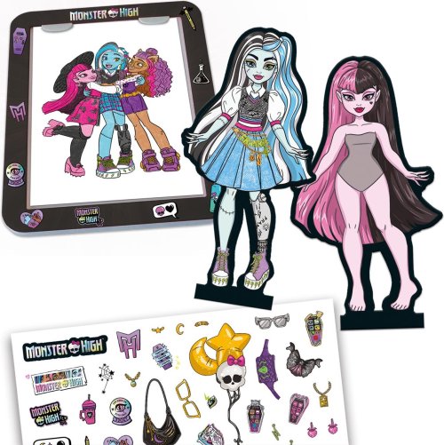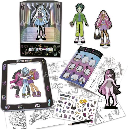 Kreativní sada obsahuje vše potřebné k navržení oblečení pro panenku pomocí tabletu s funkcí podsvícení. Připevněte na tablet papír, připravte návhr oblečení, vybarvěte a ozdobte. Sada obsahuje: