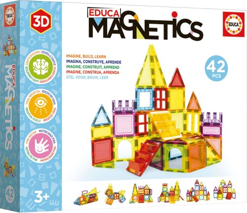 Představ si - postav - uč se! Kreativní magnetická stavebnice Magnetics od španělského výrobce EDUCA umožňuje sestavovat velké množství trojrozměrných objektů, pomocí dvourozměrných plastových mnohoúhelníků.