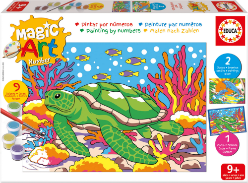 Postupně vybarvujte jednotlivé části podle návodu (každé číslo na plátně odpovídá jedné konkrétní barvě). Kreativní aktivita, která pomáhá rozvíjet soustředění, koordinaci, rozpoznávání barev a to vše zábavnou formou. Balení obsahuje: 2 obrázky o rozměru 20,5 x 15,5 cm s očíslovanými částmi, barevnou předlohu, sadu 9 barev se stojánkem, plastový rámeček na postavení a štětec.