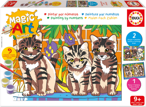 Postupně vybarvujte jednotlivé části podle návodu (každé číslo na plátně odpovídá jedné konkrétní barvě). Kreativní aktivita, která pomáhá rozvíjet soustředění, koordinaci, rozpoznávání barev a to vše zábavnou formou. Balení obsahuje: 2 obrázky o rozměru 20,5 x 15,5 cm s očíslovanými částmi, barevnou předlohu, sadu 9 barev se stojánkem, plastový rámeček na postavení a štětec.