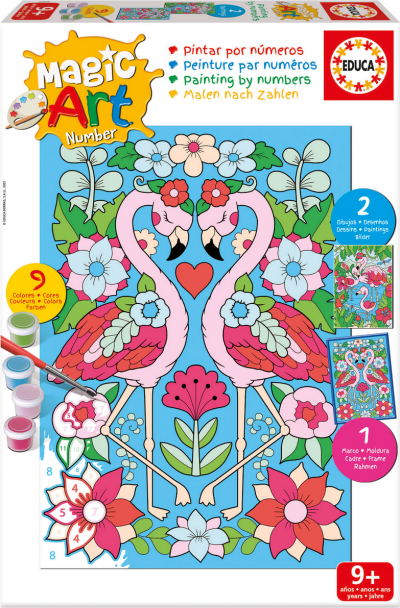 Postupně vybarvujte jednotlivé části podle návodu (každé číslo na plátně odpovídá jedné konkrétní barvě). Kreativní aktivita, která pomáhá rozvíjet soustředění, koordinaci, rozpoznávání barev a to vše zábavnou formou. Balení obsahuje: 2 obrázky o rozměru 20,5 x 15,5 cm s očíslovanými částmi, barevnou předlohu, sadu 9 barev se stojánkem, plastový rámeček na postavení a štětec.