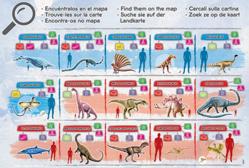 Zeměpisné puzzle pro děti s ilustracemi dinosaurů s vyobrazením kontinentů v různých geologických obdobích. Součástí balení je i informační leták s názvy a informacemi o dinosaurech (hmotnost, délka, velikost v porovnání s člověkem, období, preferovaná potrava...). Jakmile puzzle poskládáte, můžete jednotlivé dinosaury hledat na mapě a pojmenovávat. Poznámka: Na začátku druhohor, kdy žili dinosauři, tvořil zemi jediný kontinent nazývaný Pangea. Vyobrazení kontinentů na puzzle je aktuální a odpovídá tomu, jak jej známe dnes. Rozměr složeného puzzle cca 48 x 34 cm