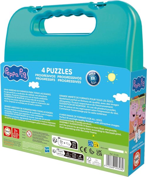 Progresivní puzzle s různou obtížností - 4 puzzle se 6 - 16 dílky, s vyšším počtem dílků se zmenšuje jejich velikost. Puzzle je baleno v plastovém kufříku. Rozměr složeného puzzle cca 16 x 16 cm