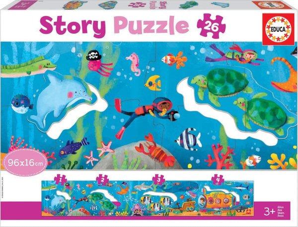 Panoramatické puzzle pro nejmenší děti s příběhem o životě pod mořskou hladinou a jeho objevováním.