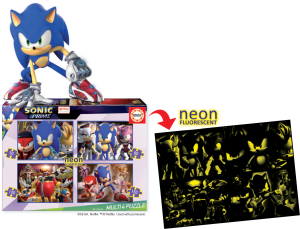 Čtyři samostatné puzzle o velikosti 34 x 24 cm, ale s různým počtem dílků (od 50 do 150), postupně vedou ke zdokonalování při skládání a zvyšování obtížnosti. Progresivní puzzle = s vyšším počtem dílků se zmenšuje jejich velikost. Neonové - fluorescenční puzzle svítící ve tmě ze série NEON FLUORESCENT. Na puzzle nanesená flurescenční vrstva barvy přes den absorbuje světlo, což způsobí, že ve tmě části puzzle svítí. Rozměr složeného puzzle cca 34 x 24 cm