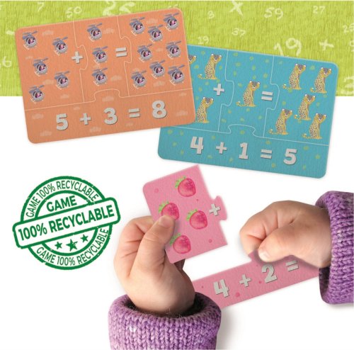 Puzzle seznamuje děti s čísly a počítáním obrázků, začnou používat matematické symboly +, -, =, naučí se základy sčítání a odečítání, každé rovnici odpovídají 4 dílky puzzle, skládání rozvíjí jemnou motoriku, logické myšlení a trpělivost, 100% recyklovatelné.