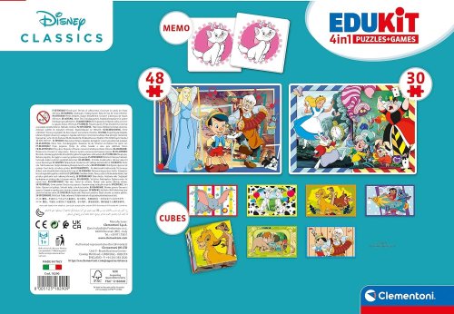 Soubor her 4v1 Disney postavičky od Clementoni. Obsahuje puzzle 30 a 48 dílků, 6 platových kostek a pexeso. Puzzle je o stejném rozměru 24 x 17 cm, ale s různým počtem dílků, proto se s vyšším počtem dílků zmenšuje jejich velikost. Baleno v kartonové krabici s plastovým uchem pro snadné přenášení. Rozvíjí paměť, logické dovednosti a manuální zručnost. Rozměr balení: 37x26x4,6 cm. Věk 3+