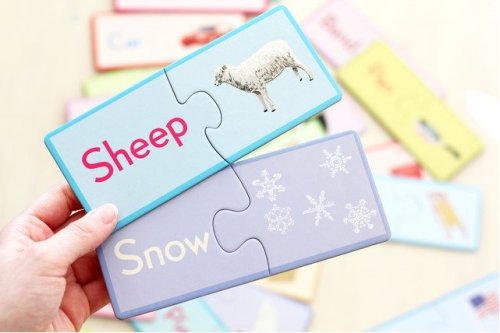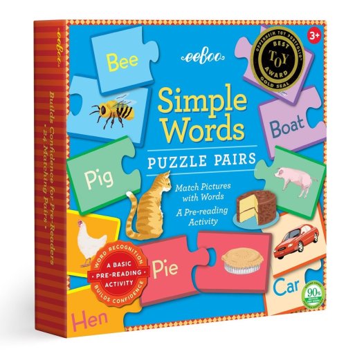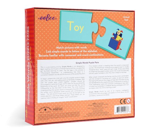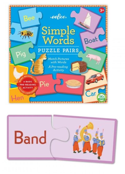 Párovací puzzle s obrázky a anglickými slovíčky je zábavnou formou výuky cizího jazyka. - Nejprve lze párovat dílky podle barev. - Postupně se děti naučí jednotlivá anglická slovíčka, která párují s obrázky. - Dílky jsou vyrobeny z odolného silného kartonu. - Názvy obrázků jsou uvedeny v angličtině. Dlouho předtím, než se děti naučí číst, začínají rozpoznávat jednotlivá slova. Když dospělý přečte slovo, dítě vybere odpovídající obrázek a složí z něj kompletní puzzle, dochází k většímu propojení znalostí. Vyrobeno z 90% recyklovaného šedého kartonu a tišteno inkousty na rostlinné bázi. Puzzle od amerického výrobce EEBOO. Rozměr složeného puzzle cca 15,2 x 6,5 cm