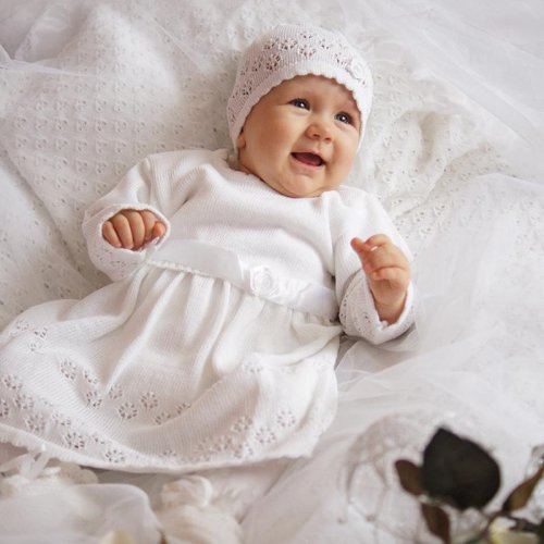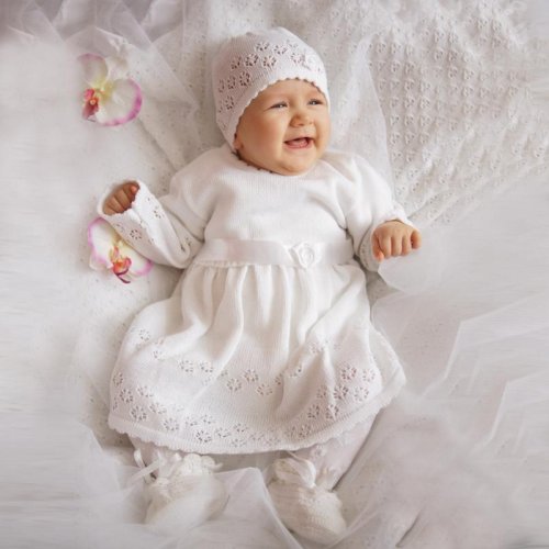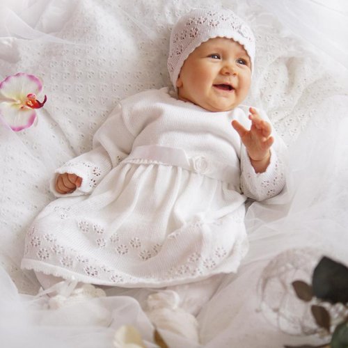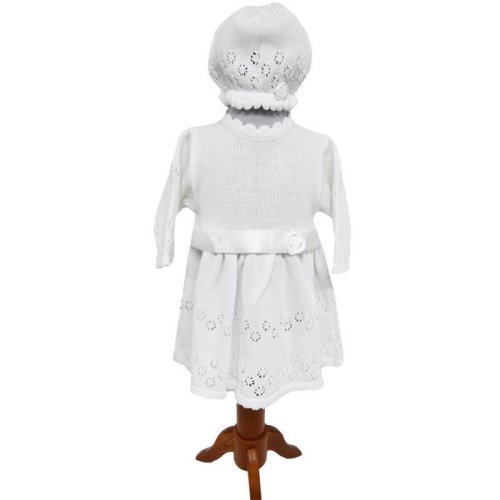 Souprava se skládá ze šatů a čepice, které jsou vyrobené z pleteniny s ozdobným ažurovým vzorem a ozdobnou stuhou.