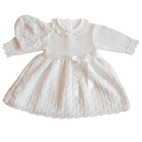 Souprava se skládá ze šatů a čepice, které jsou vyrobené z pleteniny s ozdobným ažurovým vzorem a ozdobnou stuhou.
