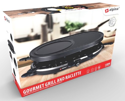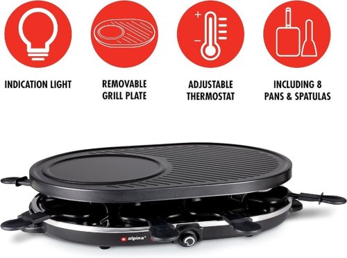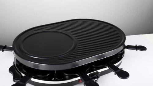Elektrický gril kombinuje raclette a grilování – jedna polovina elektrického grilu je kamenná deska, druhá grilovací deska a dole se nachází 8 gurmánských pánviček.