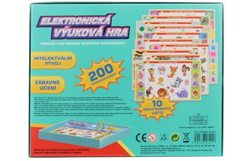 Elektronická výuková hra v českém jazyce.. Hra nabízí zábavné učení formou hry. Hledáte způsob, jak vaše děti naučit základy počítání, angličtiny, tvarů nebo profesí zábavnou a poutavou formou? Chcete, aby se vzdělávaly s radostí a samy si osvojovaly nové dovednosti? Představujeme Elektronickou výukovou hru CZ, která kombinuje učení s hrou a motivuje děti k objevování světa vědomostí už od raného věku! Balení obsahuje 10 oboustranných listů s úkoly. Napájení na 2xAAA baterie, které nejsou součástí balení. Funkce: Hra obsahuje 2 plastová ukazovátka. Po správném splnění úkolu hra vydá zvuk a oznámí správný výsledek. V případě chybné odpovědi zvuk není žádný. Materiál karton+plast. Baleno v krabici. Rozměry balení 29x24x4 cm. Věk 3+