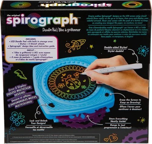 Vytvářejte nekonečné Spirograph vzory na obrazovce pomocí koleček šablony! Kreslete snadno na cestách nebo doma a poté uložte a vystavte své barevné kresby. Resetujte obrazovku stisknutím tlačítka a pokračujte ve vytváření nových návrhů! Žádný papír, žádná pera, žádný nepořádek! Obsah balení: