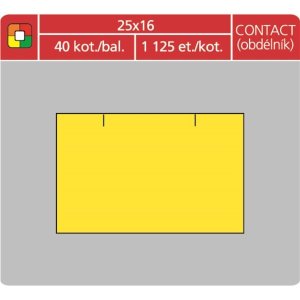 Cenové etikety CONTACT určené na označování výrobků cenou, datem (např. minimální trvanlivostí), případně dalšími doplňujícími údaji Barva: žlutá Prodáváme po jednom kotoučku, který obsahuje 1 125 etiket …