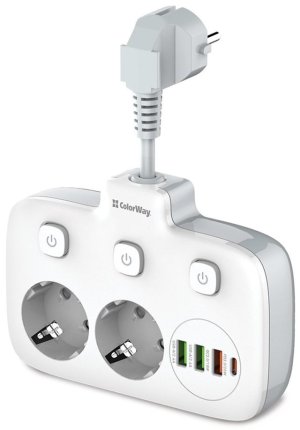 ColorWay CW-CHE24PDW; Kompaktní prodlužovací přívod se dvěma Schuko zásuvkami, třemi USB porty a jedním USB-C konektorem .