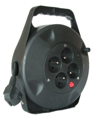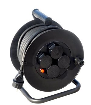 Černý prodlužovací kabel na navinovacím bubnu pro vnitřní použití.