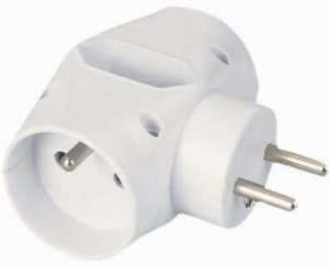 Roztrojka 230V - bílá - 250V, celkem 16A max. - baleno po 1ks - závěs s EAN kodem - 1x kulatá zástrčka - 2x kulatá zásuvka + 1x plochá zásuvka