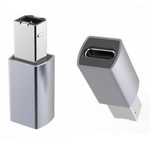 Redukce pro zapojení kabelu USB-C female do USB2.0 B Male, podpora přenosu dat a nabíjení, hliníkové pouzdro adaptéru, oboustranné zasouvání konektorů, barva space šedá.