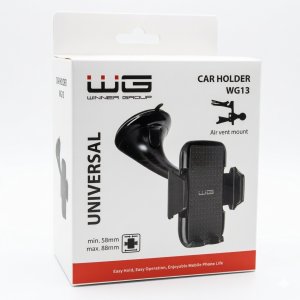 Praktický držák telefonu značky WG, který se na čelní sklo upevní pomocí kvalitní přísavky.