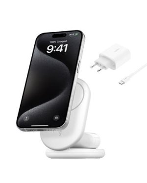 Tento mimořádně praktický skládací nabíjecí stojan poskytuje 15 W rychlého bezdrátového nabíjení pro váš iPhone a další zařízení podporující Qi2.