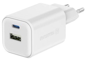 SWISSTEN GaN 1× USB-C PD 45 W + 1× USB QC 18 W; Univerzální napájecí adaptér s výkonem až 45 W .