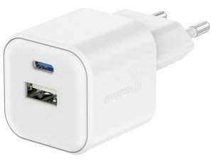 SWISSTEN GaN 1× USB-C PD 20 W + 1× USB QC 18 W; Univerzální napájecí adaptér nabízející jeden konektor USB-C s výkonem až 20 W a jeden konektor USB s výkonem až 18 W .