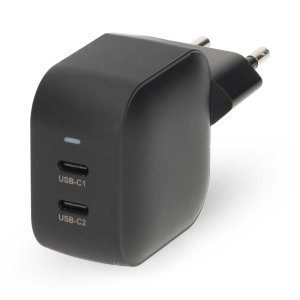 Nedis WGCHA45WBK Kompaktní 45W GaN nabíječka s dvojicí USB-C portů pro rychlé nabíjení dvou zařízení současně.
