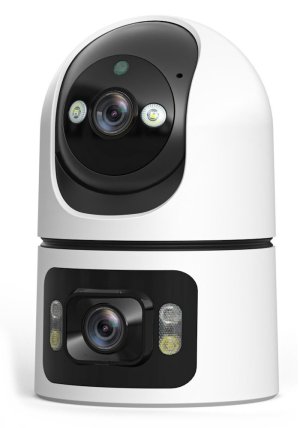 Inteligentní vnitřní bezpečnostní kamera s duálním objektivem, 4MP rozlišením a 360° pokrytím.