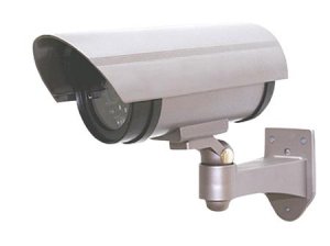Velmi realistická atrapa šedé venkovní kamery s blikající LED diodou a realistickou infračervenou LED.