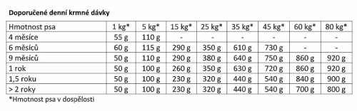 Obsahuje minimálně 60 % proteinů živočišného původu. 220 g jehněčí moučky v 1 kg krmiva odpovídá 820 g čerstvého masa.