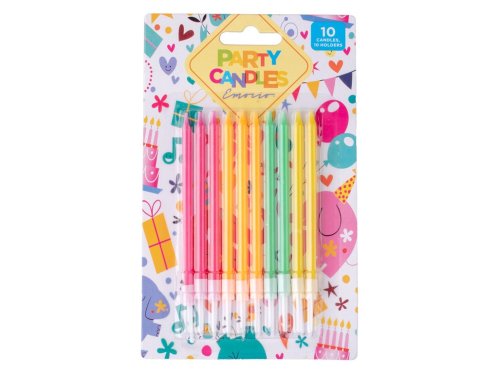Dortové svíčky Emocio v sadě po 10 kusech o délce 90 mm doplněné 10 dlouhými svícny pro bezpečné a stabilní umístění do dortu. Barevný mix svíček dodá slavnostní atmosféru každé oslavě. Svíčky rovnoměrně hoří, snadno se zapalují a díky prodlouženým svícnům pevně drží i v měkčích dezertech. Ideální doplněk pro narozeniny i jiné slavnostní příležitosti. Zboží je dodáváno v mixu. Doručované zboží je vybíráno náhodně a nelze vybrat konkrétní provedení.