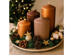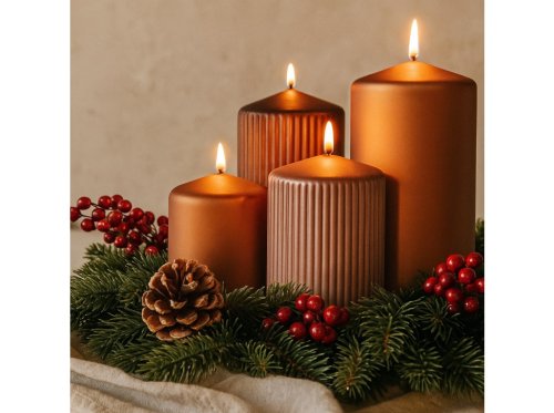 Sada čtyř válcových svíček Emocio o průměru 65 mm kombinuje hladké a rýhované provedení. Metalický mat dodává dekoraci sofistikovaný a elegantní vzhled. Ideální pro stolní aranžmá, adventní dekorace nebo samostatné vystavení.