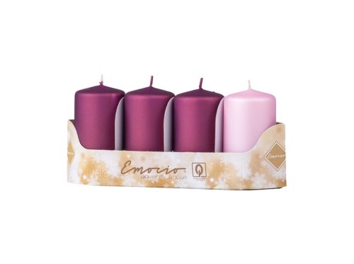 Sada 4 kusů válcových svíček Emocio o rozměru 40×75 mm v metalickém matném fialovém provedení. Barevné odstíny jsou dodávány v mixu, jednotlivé svíčky se mohou mírně lišit tónem.