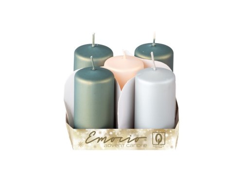 Sada 5 kusů válcových svíček Emocio o rozměru 40×75 mm v metalickém matném zeleném provedení. Barevné odstíny jsou dodávány v mixu, jednotlivé svíčky se mohou mírně lišit tónem.