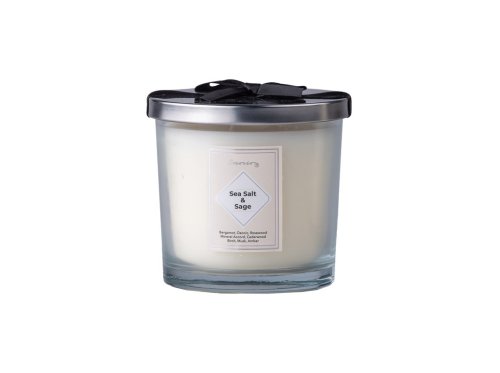 Emocio svíčka Sea Salt & Sage v elegantním skleněném svícnu s plechovým víčkem a mašličkou přináší do vašeho domova svěží vůni mořské soli a šalvěje. Dekorativní design s mašličkou je ideální pro aranžmá v interiéru nebo jako stylový dárek.