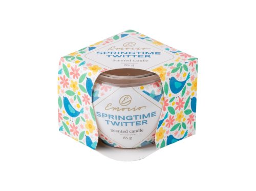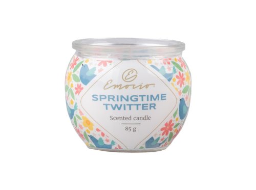 Emocio vonná svíčka ve skle Springtime Twitter, Blossoms & Spring Rain Dekor přináší do vašeho domova osvěžující vůni jara. Tato svěží květinová vůně navodí radostnou atmosféru. Její rozměry jsou 70x62mm.