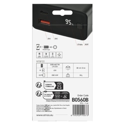Značka EMOS Objednací číslo B0560B Produktové číslo 1613056000 EAN 8592920140673 auto ON/OFF ano kapacita akumulátoru 20 000 mAh/74 Wh typ akumulátoru Li-Po 3,85 V max. výkon drátového nabíjení 65 W doba nabíjení 2,5 hodiny passthrough ano barva černá LED indikátor nabíjení ano LED indikátor stavu baterie ano přibalený kabel USB-C/USB-C, data rychlé nabíjení PD 65 W hmotnost 334 g materiál ABS plast max. vstupní výkon 65 W ochrana proti podbití ano ochrana proti přebití ano ochrana proti přetížení ano ochrana proti zkratu ano provozní teplota 0 °C až +40 °C typ vstupního rozhraní 1× micro USB, 1× USB-C typ výstupního rozhraní 1× USB-A, 1× USB-C záruční doba 2 roky rozměr 100 × 64 × 32 mm prodejní obal 1 ks, papírová krabička