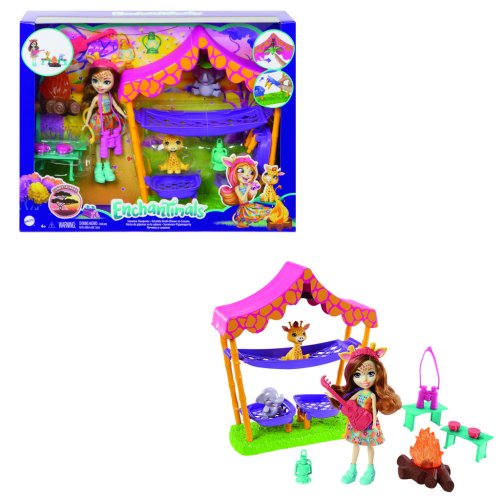 Prozkoumejte Sunny Savanna ™ se žirafou Griselda Giraffe ™ a jejími zvířecími nejlepšími kamarády! Tento herní set Enchantimals Savannah Sleepover ™ je plný her na vyprávění příběhů. Shromážděte se na lavičkách a usedněte u táboráku pro speciální čas sbližování Enchantimals ™ pomocí zábavného příslušenství, jako je kytara, hrnky, lucerny a další. Pak jděte do stanu pro sladké sny Savany! Pod „listovým“ stropním ventilátorem, který se točí, je houpací síť pro žirafu Griseldu, plus 2 postele pro žirafu se jménem Antenna ™ a slona se jménem Stompah ™! Malé děti si budou rády hrát na speciální pouto, které sdílejí přátelé Enchantimals ™! Barvy a dekorace se mohou lišit.