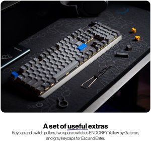 V krabici najdete kompletní sadu příslušenství: bezdrátový USB přijímač, nástroje na sejmutí kláves a spínačů, dva náhradní spínače Endorfy Yellow a minimalistické šedé klávesy Esc a Enter pro doladění vzhledu.