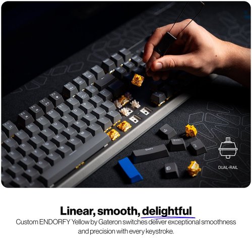 Exkluzivní lineární spínače vyvinuté ve spolupráci se značkou Gateron zajišťují výjimečně plynulý a přesný chod. Továrně lubrikovaná konstrukce s nylonovou základnou a dvoustupňovou pružinou poskytuje měkký stisk s hlubokým a příjemným zvukem.