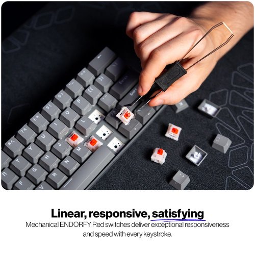 Exkluzivní lineární mechanické spínače inspirované oblíbenými spínači Endorfy Yellow. Mléčné pouzdro zajišťuje lepší rozptyl světla pro podsvícení, zatímco tovární předlubrikace garantuje hladký chod s hlubokým akustickým profilem.