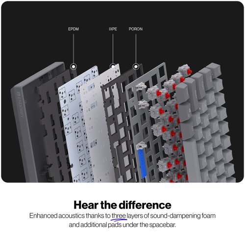 Speciální pozornost byla věnována akustickému ladění – klávesnice obsahuje tři vrstvy akustické pěny (PORON, EPDM a IXPE), které minimalizují ozvěnu a eliminují dutý zvuk. Dokonce i mezerník je utlumen silikonovými podložkami pro čistý a uspokojivý zvukový projev při psaní.