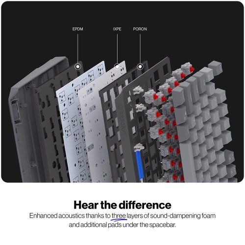 Klávesnice je vyrobena z prémiových materiálů a vyztužena pevnou hliníkovou horní deskou, díky čemuž nabízí robustní a vyvážený pocit při používání. Tři vrstvy akustické pěny PORON, EPDM a IXPE minimalizují ozvěnu a eliminují dutý zvuk při psaní pro čistý a uspokojivý akustický zážitek.