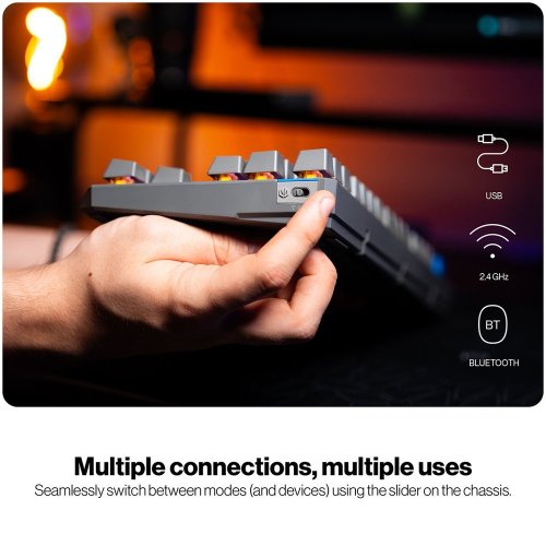Bezdrátová herní klávesnice Endorfy Thock V2 TKL Wireless CZ ví, že pro vítězství se počítá každý centimetr na stole. Tento model vměstná špičkový výkon do kompaktního těla. Provedení s 87 klávesami v TKL rozložení podpoří komfortní ovládání her, tvůrčích aplikací, a ještě k tomu uvolní prostor pro umístění myši. Kromě drátového připojení podporuje tako verze také bezdrátovou konektivitu pomocí Bluetooth nebo přes USB dongle s 2,4GHz technologií.