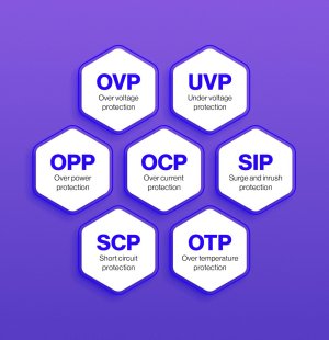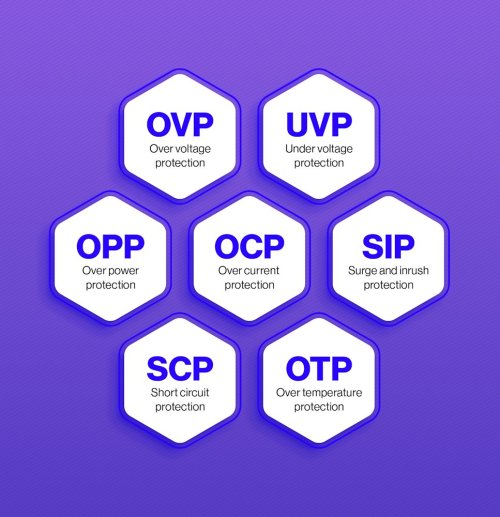 Ochrany: OVP (ochrana proti přepětí) UVP (ochrana proti podpětí) OCP (ochrana proti nadproudu) SCP (ochrana proti zkratu) OPP (ochrana proti přetížení) SIP (ochrana proti nárazovému proudu) OTP (ochrana proti přehřátí)